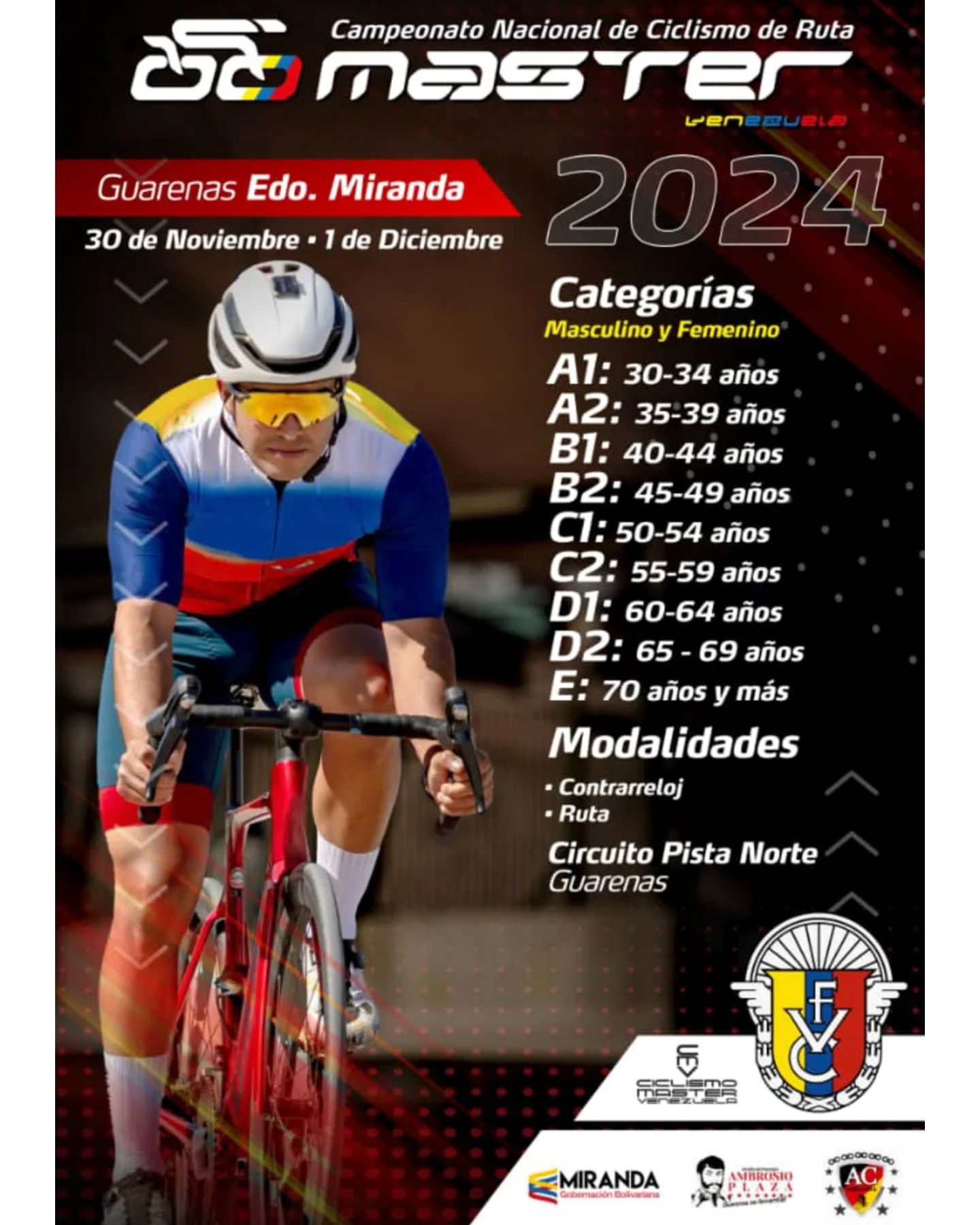 Es una competencia para dilucidar el campeón nacional de Venezuela del año 2024, en las distintas categorías máster, en las modalidades de ruta y contrarreloj. Se hará sobre un circuito de 11 km en la autopista de Guarenas, conocida como Pista Norte, con distancias variadas de acuerdo con los siguientes cuadros.